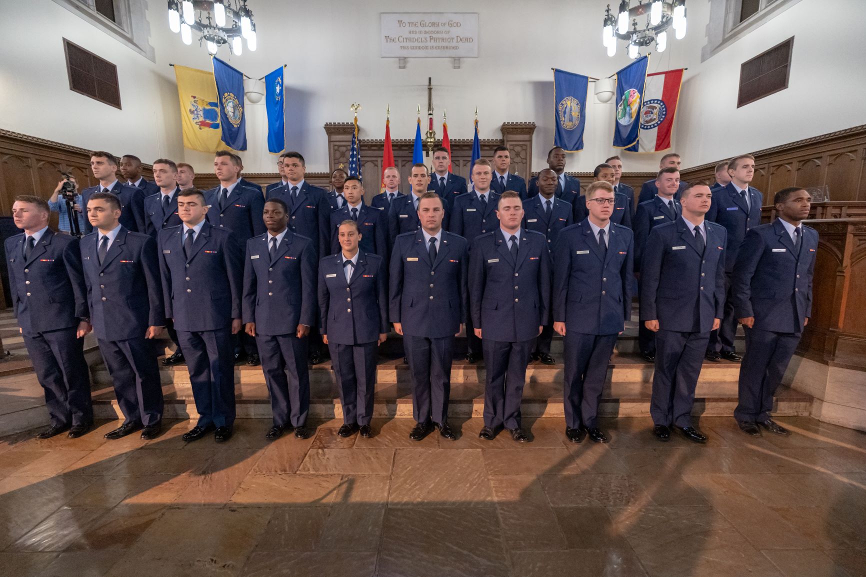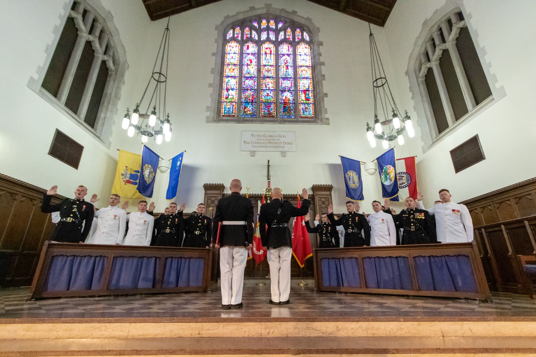 The commissioning ceremony for cadets going into the Army was held in McAlister Field House, while the ceremonies for the cadets going into the Air Force, the Navy and the Marines was held in Summerall Chapel.