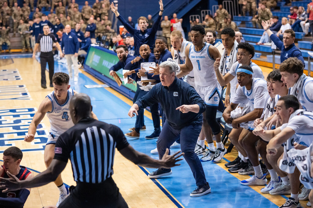 Citadel Basketball Head Coach Ed Conroy and his team on their feet in the final moments of their game against Samford.