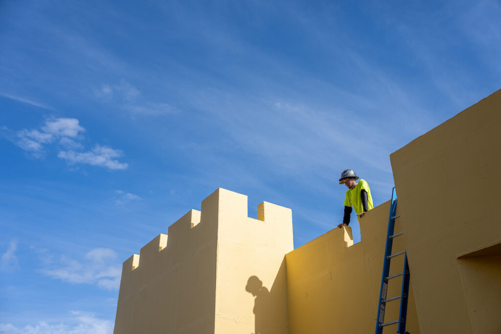 Construction workers work on the renovation of the Krause School of Leadership and Ethics.