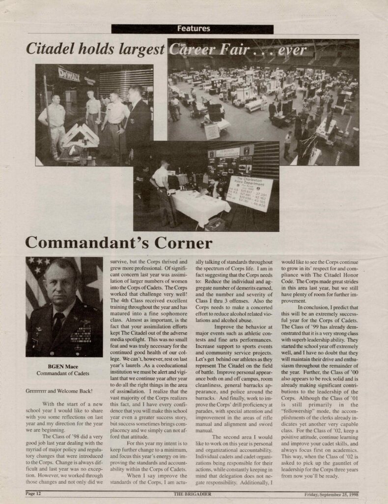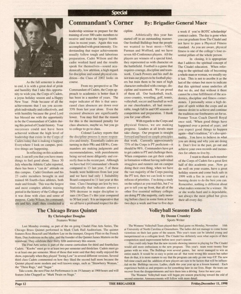 “Brig. Gen. Mace was one of The Citadel’s most decorated graduates who lead our cadets and community through a period of tremendous change,” said The Citadel President Gen. Glenn Walters, USMC (Ret.), ’79. “He was a model Citadel officer and he will be greatly missed. On behalf of The Citadel, Gail and I offer our deepest condolences to his entire family on his passing.”