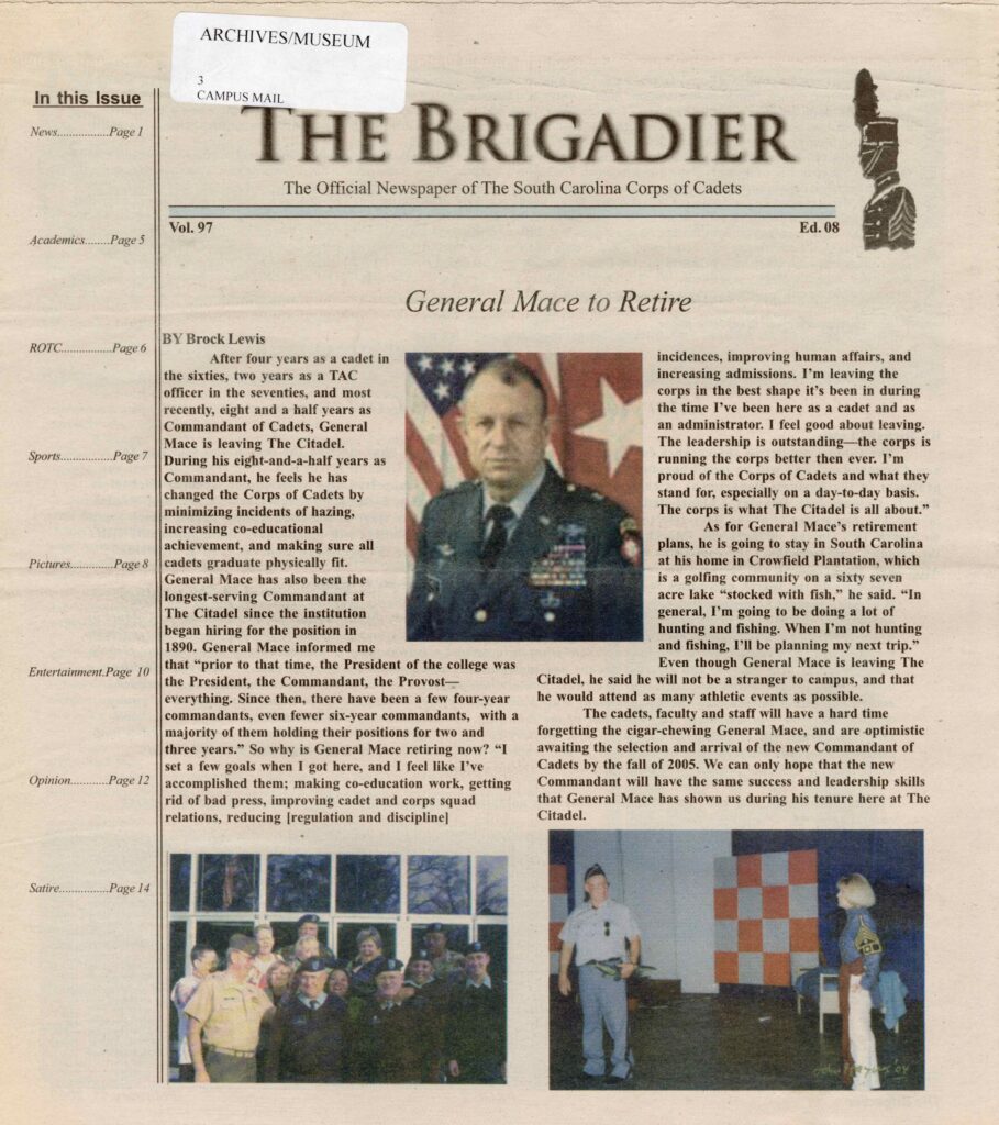 Upon retirement, Gen. Mace returned to Charleston, South Carolina, where he practiced real estate, served as Director of Safety for the South Carolina Department of Corrections, and became Commandant of Cadets at The Citadel from 1997-2005 – the longest tenure of any Commandant in the institution’s history.